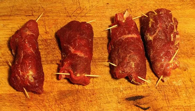 enrollar la carne alrededor de los frijoles y cerrar con uno o dos brocas.