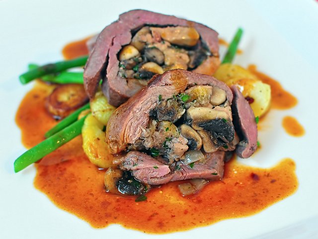 Para servir, colocar las roulades en el plato, ligar la salsa con la crema fresca e incorporarla sobre las roulades.